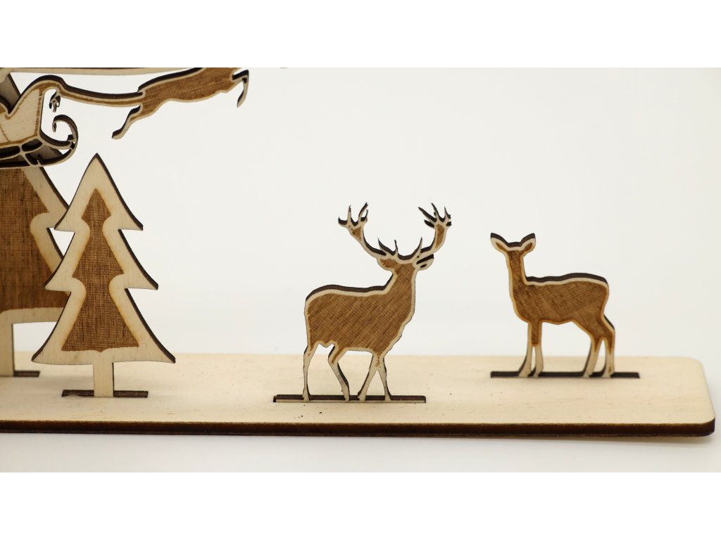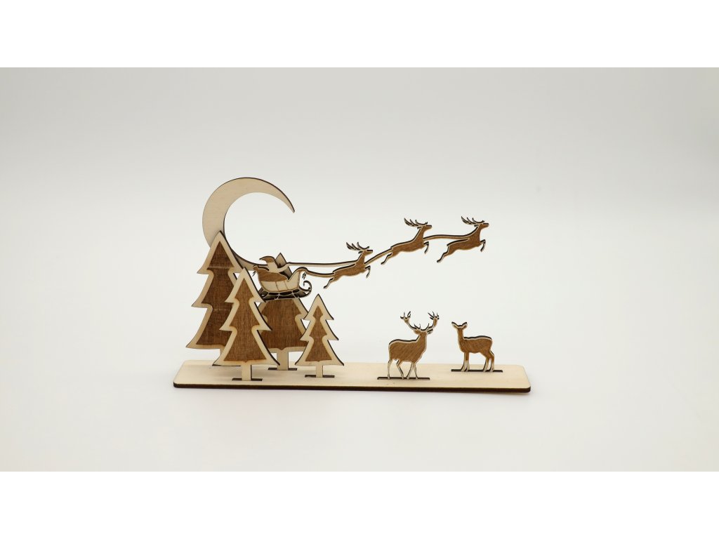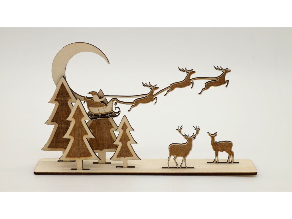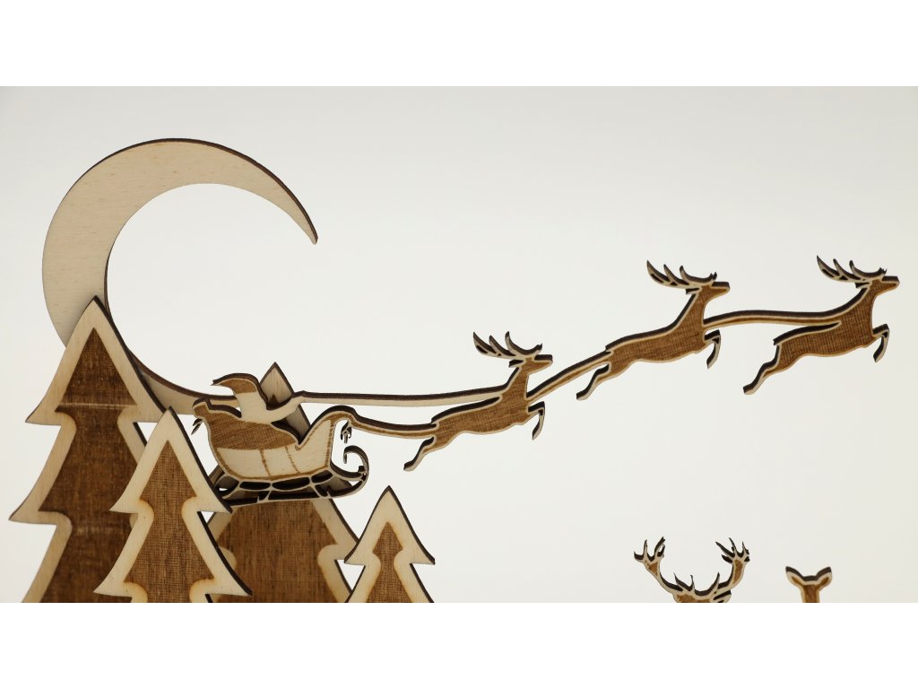 Drevená voľne stojaca dekorácia nočnej krajinky so Santom, ktorého ťahajú soby za svitu mesiaca. Dekorácia sa hodí pre Vás, alebo aj ako darček pre Vašich blízkych.
