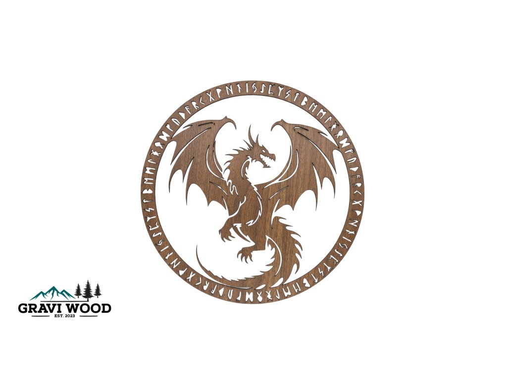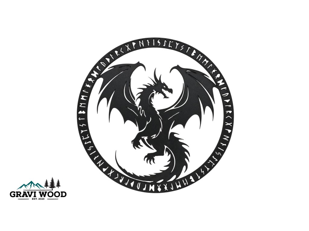 Obraz na stenu s drakom, ktorý je v kruhu s runami. Drak je symbolom sily, odvahy a zároveň je aj ochrancom. Runy, alebo runové písmo sú múdrosťou, pre ktoré sa Odin obetoval a predstavujú jeho nekonečné vedomosti a múdrosť.