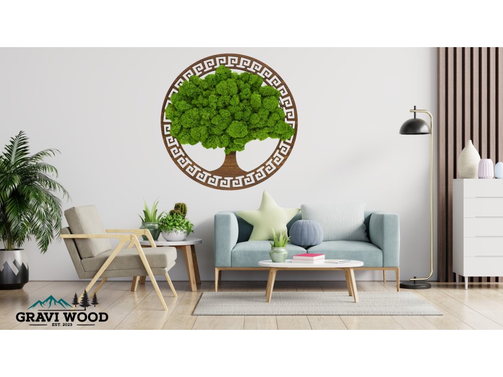 Strom života, symbol rastu, sily a prepojenia s prírodou, je precízne vyrezaný laserom z kvalitnej HDF dosky s dreveným dekorom. Okraj kruhu zdobí elegantný grécky vzor, ktorý dodáva celému dielu nadčasový a sofistikovaný vzhľad.