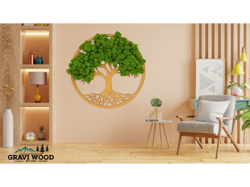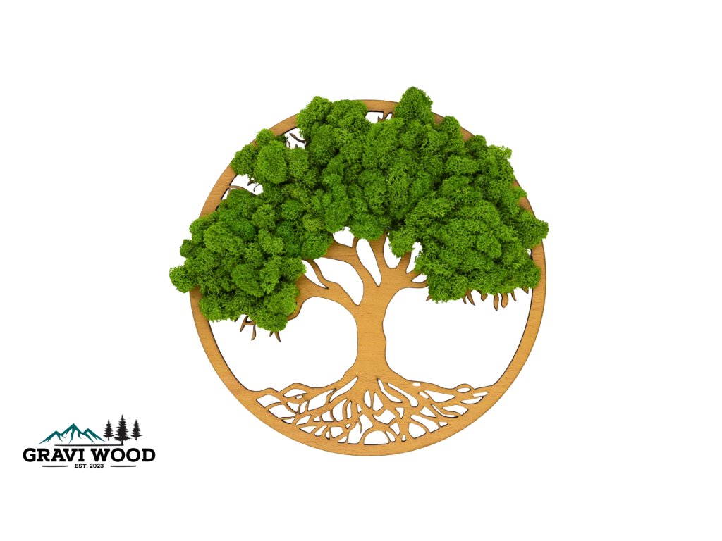 Základ tvorí precízne spracovaná 3mm HDF doska a korunu stromu tvorí pravý stabilizovaný lišajník (mach) prémiovej kvality v sviežej zelenej farbe. Každý kúsok machu je starostlivo a ručne lepený, vďaka čomu je každý obraz jedinečným originálom. Stabilizovaný mach si zachováva svoju farbu a mäkkosť po celé roky bez akejkoľvek údržby – nepotrebuje vodu, svetlo ani strihanie. Obraz nevystavujte priamemu slnečnému žiareniu, zabráňte blízkemu kontaktu s vodou a dodržujte dostatočnú vzdialenosť od vetracích a klimatizačných jednotiek a krbov.